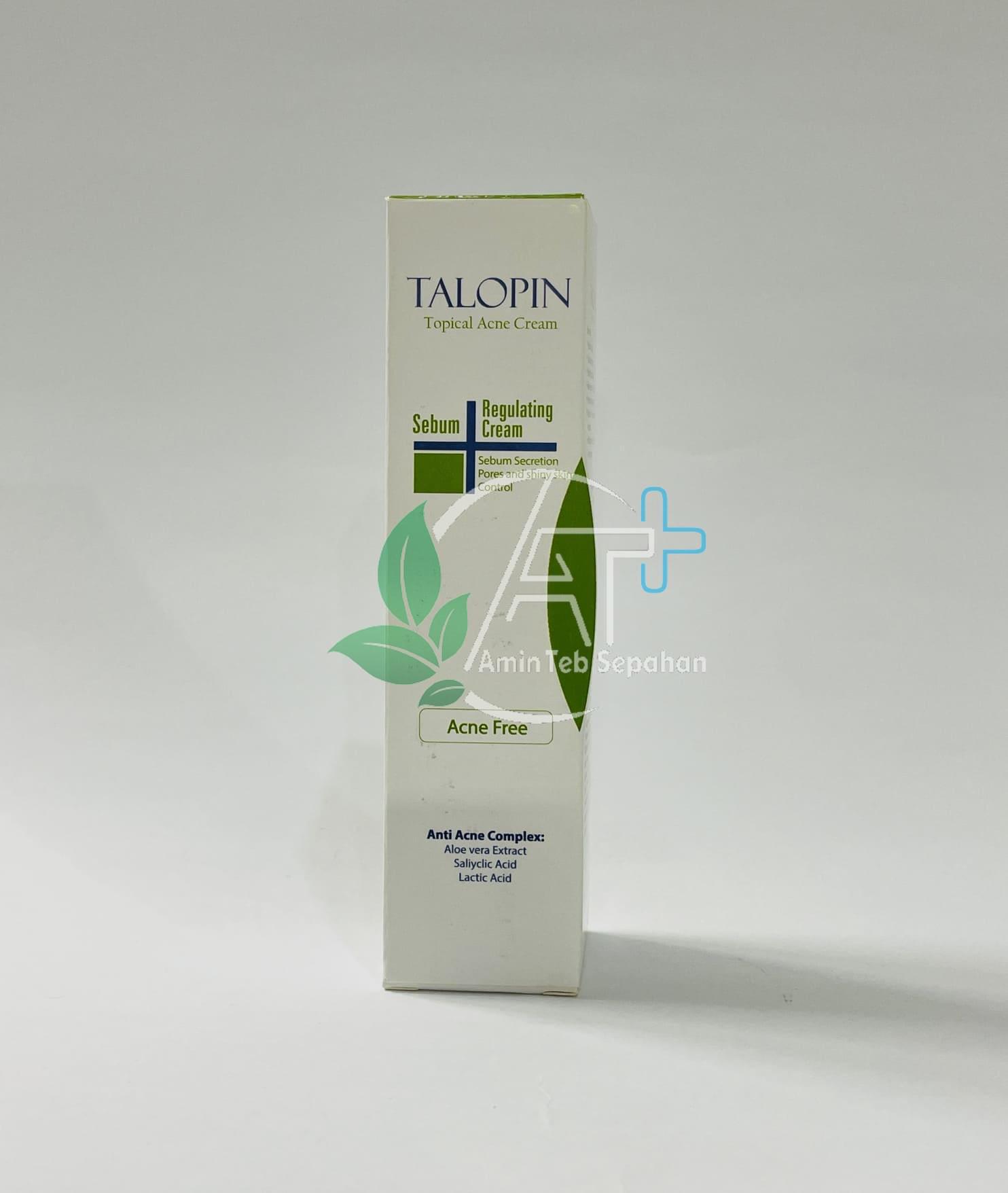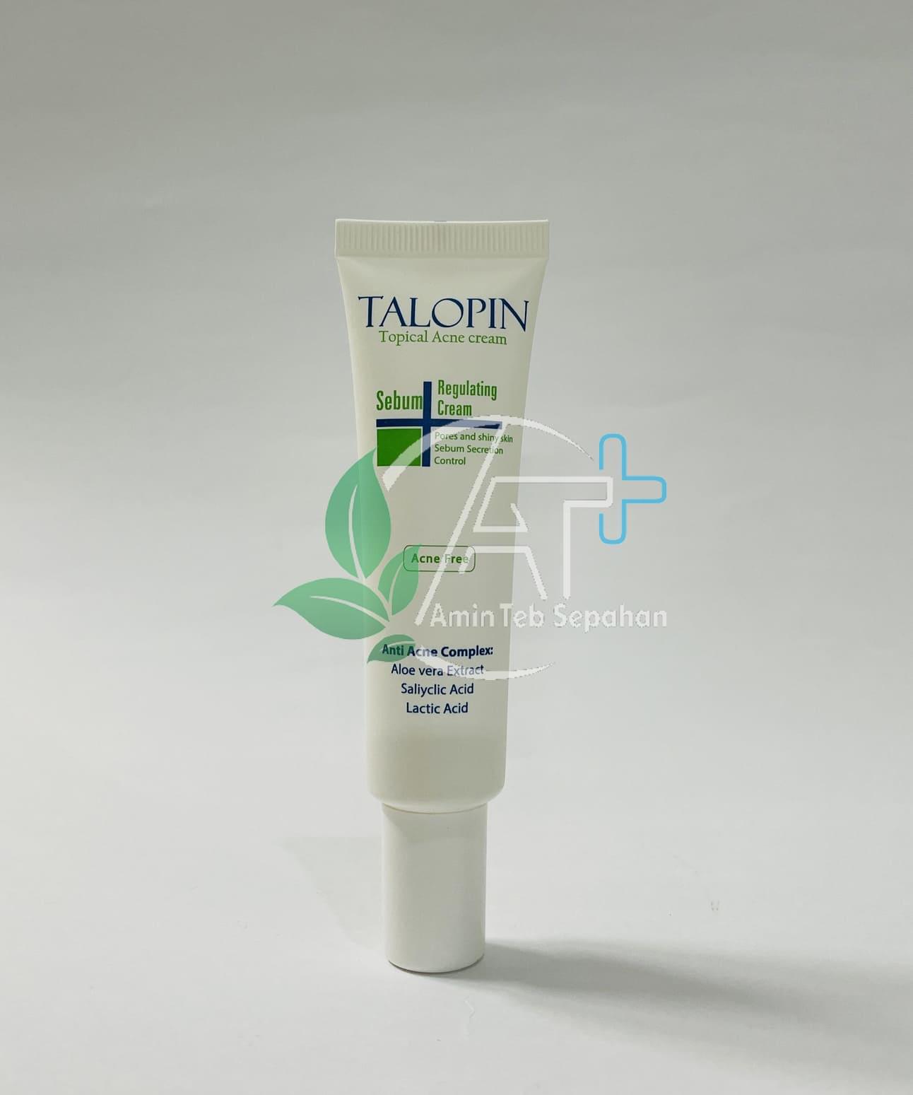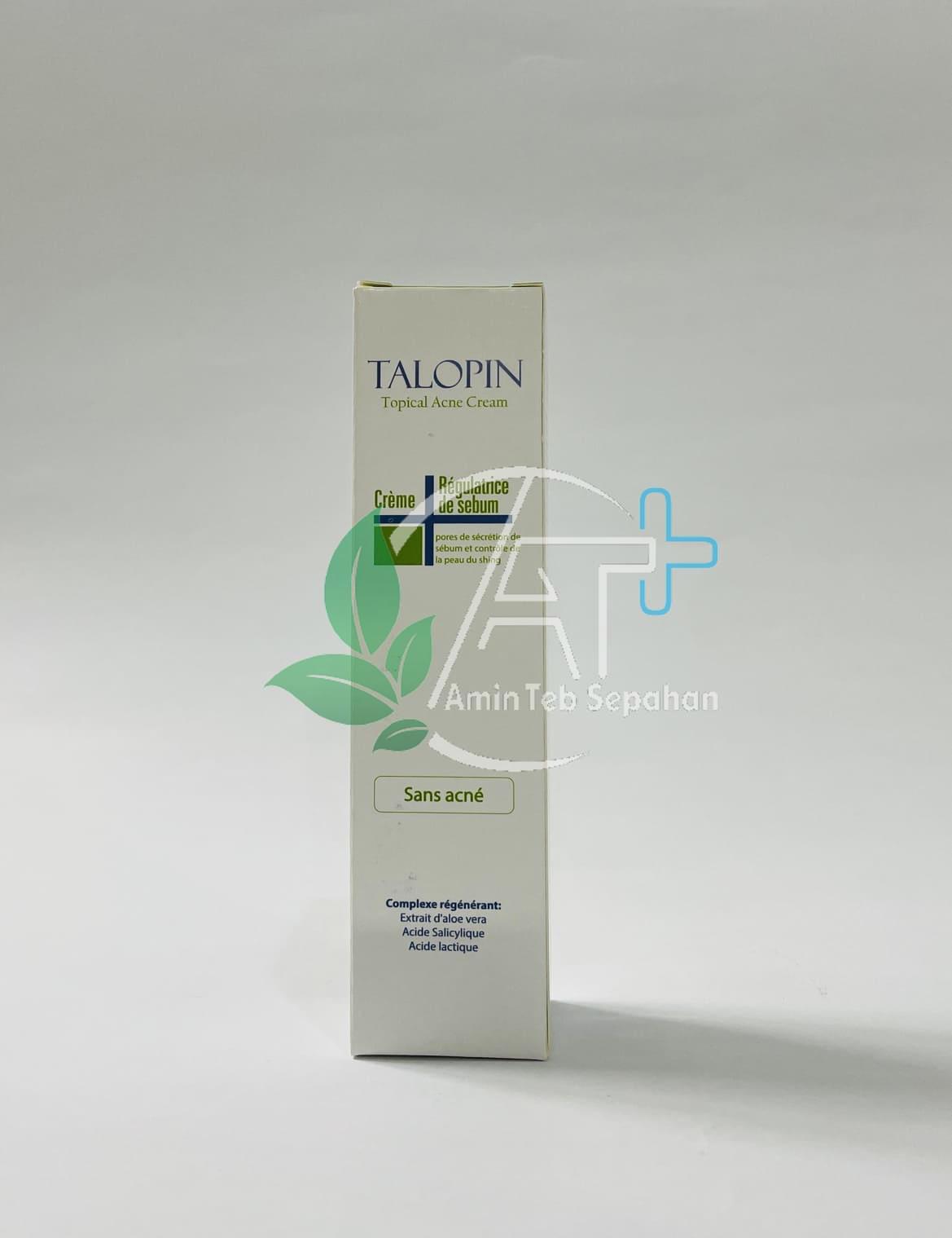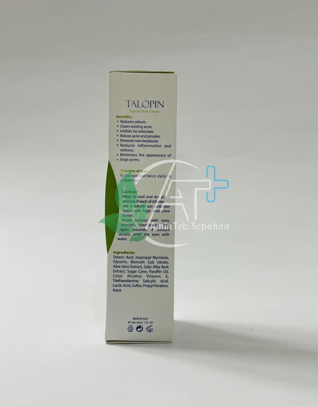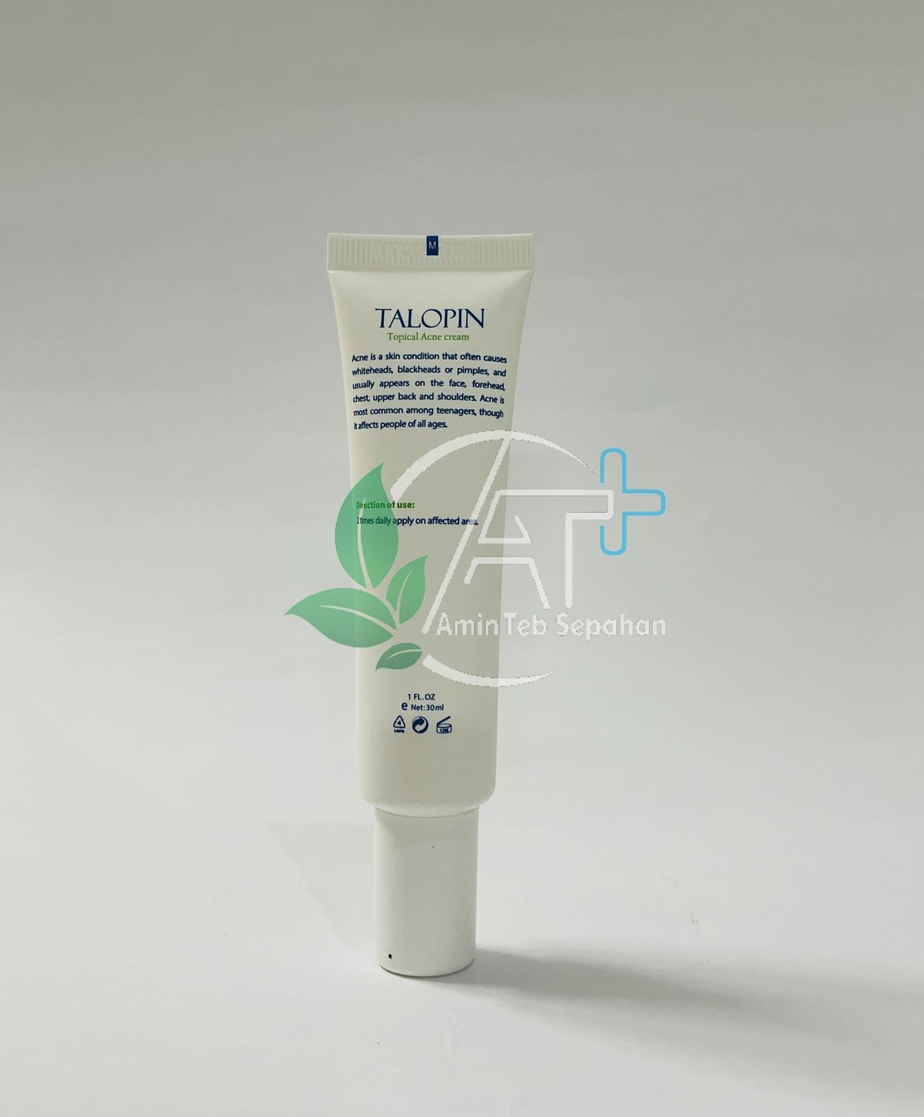کرم ضد جوش تالوپین به طور مؤثری ضایعات آکنه شامل کومدون پاپول و پوسچول را از بین برده و به رفع لکها و اسکارهای آتروفیک ناشی از آکنه کمک می نماید. ترکیبات موجود در این کرم هر چهار عامل ایجاد آکنه را مهار می نماید. این کرم باعث تنظیم ترشح چربی و جلوگیری از ایجاد جوشهای سر سیاه سر سفید و التهابی شده و همچنین ضد باکتری و قارچ عمل میکند.