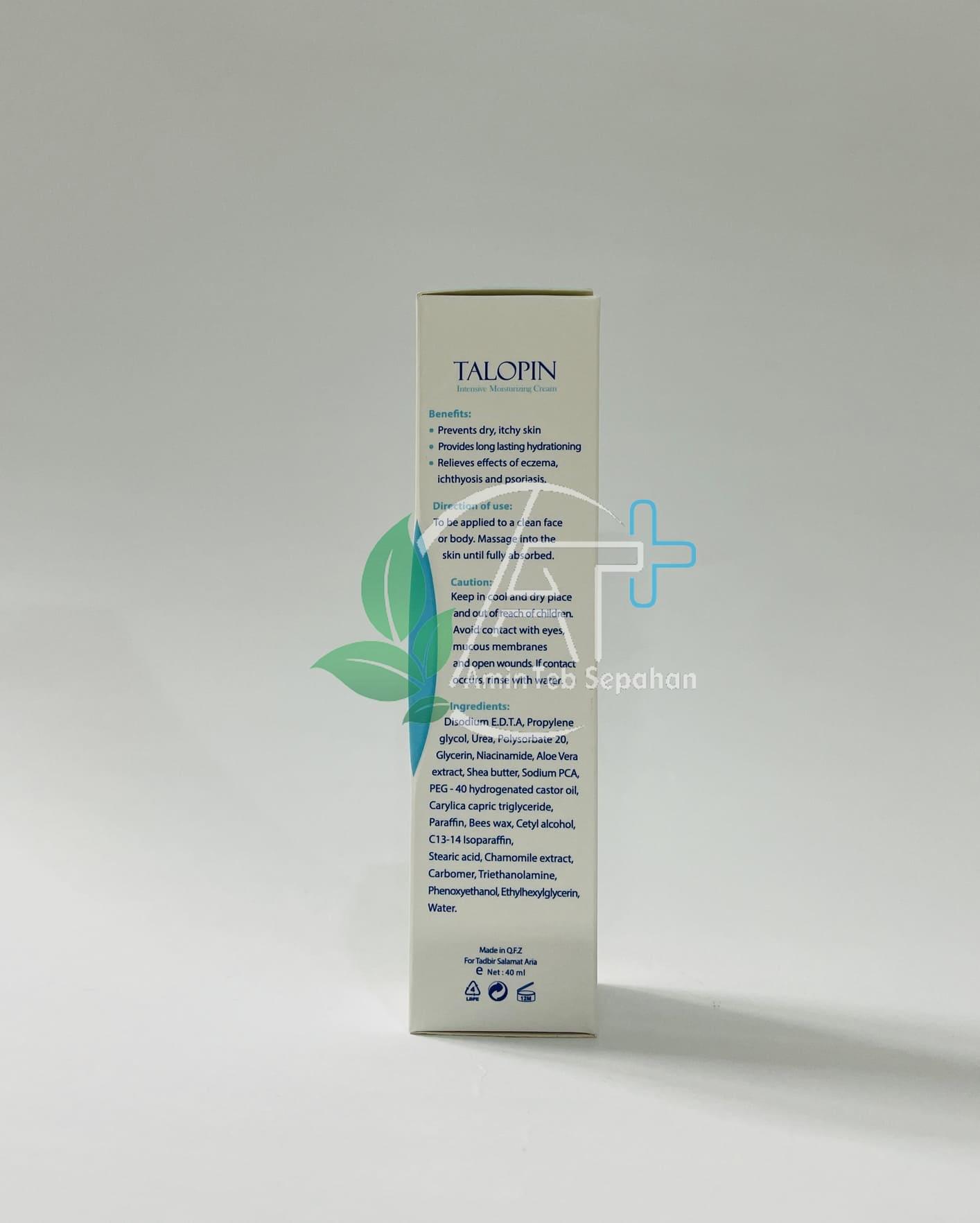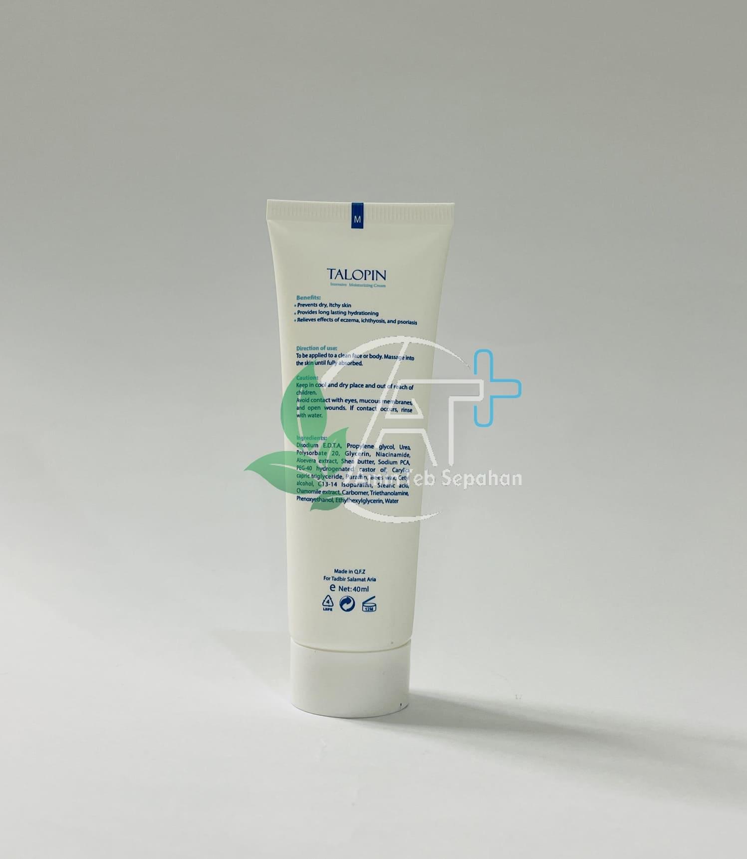 کرم مرطوب کننده قوی تالوپین با دارا بودن بافتی سبک و فاقد چربی آبرسانی قوی برای پوست میباشد همچنین ساخت کلاژن الاستین و سایر پروتئین های پوستی را افزایش داده و از تخریب آنها نیز جلوگیری میکند. این کرم کلیه فرآیندهای منجر به تسریع روند پیری پوست را کند کرده و تغذیه کامل پوست را فراهم میکند.